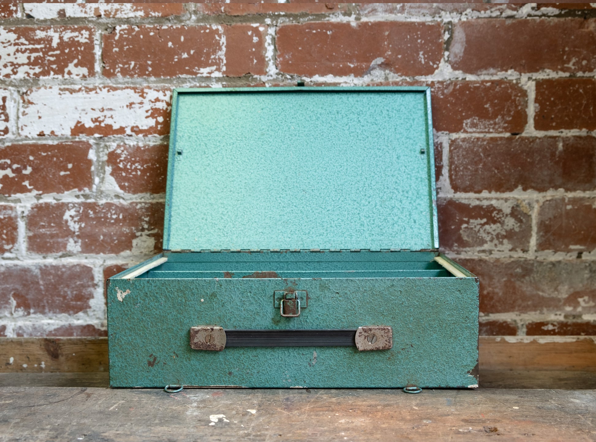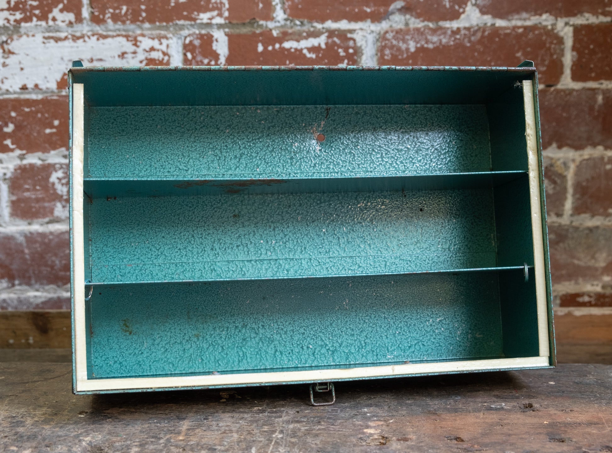 Eine aquagrüne Metallbox mit Segmenten zum Ordnen von gelagerten Waren. Ideal für Werkzeuge oder Papierwaren.
