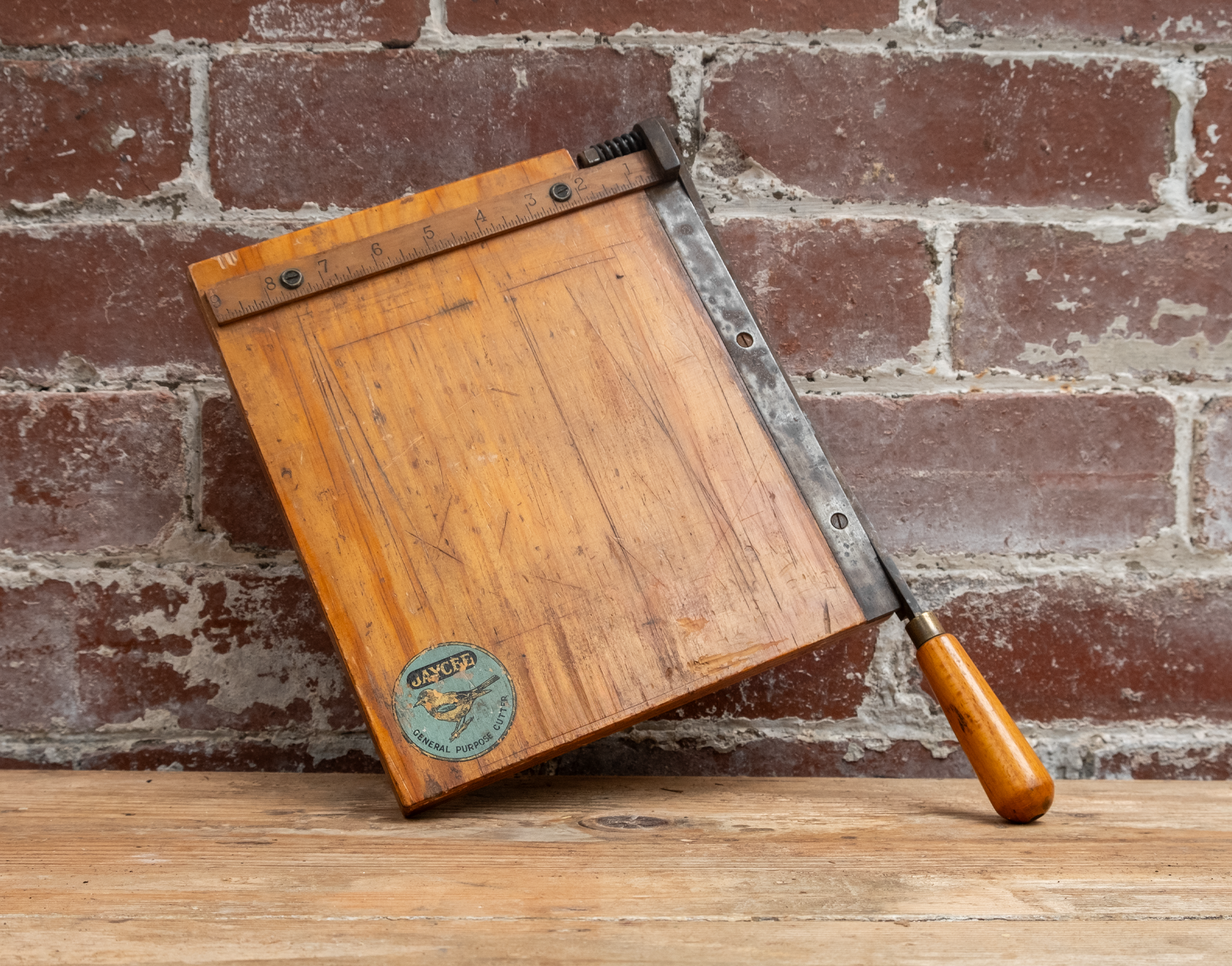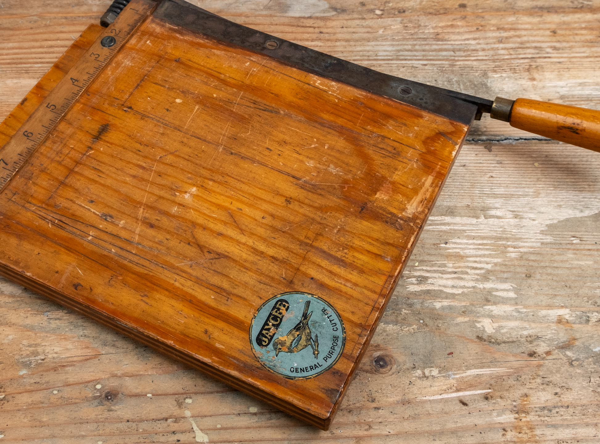 The wooden base features the Jaycee logo with a bird prominently on the lower left corner and includes a graduated bar across the top to measure out your cuts.