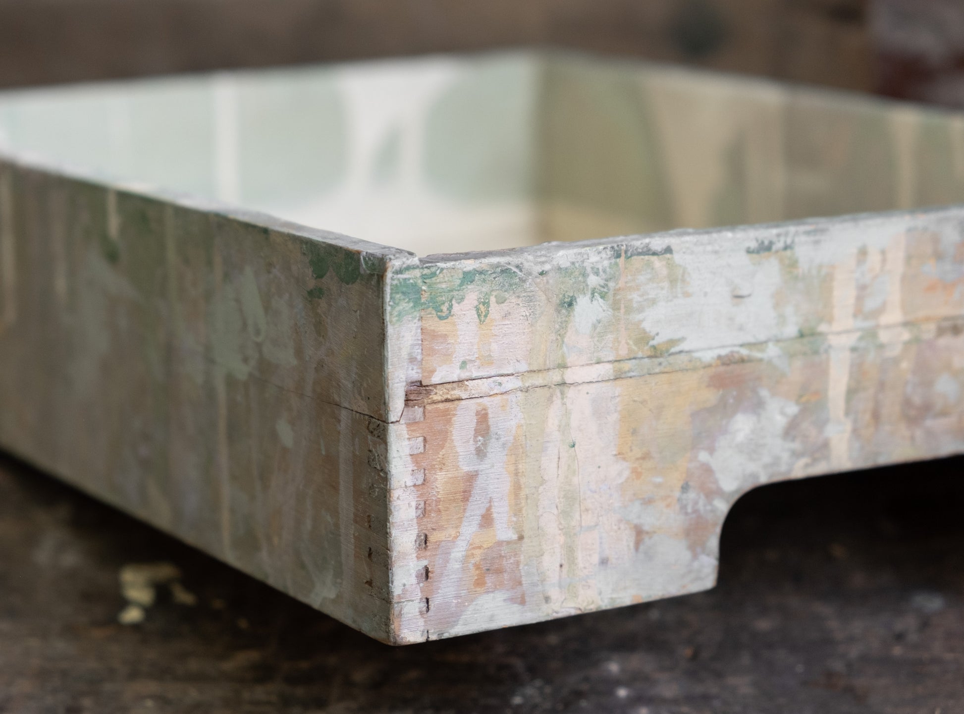 Das Set ist gebraucht und weist insgesamt Farbflecken auf. Leider ist ein Flor mit getrockneter Farbe vollgestopft. Der eigentliche Flor kann ersetzt werden, der Griff ist weiterhin funktionsfähig. Die Box ist gut aus Holz gefertigt und hat Schwalbenschwanzverbindungen, ein Detail, das man bei neuen DIY-Produkten einfach nicht findet.