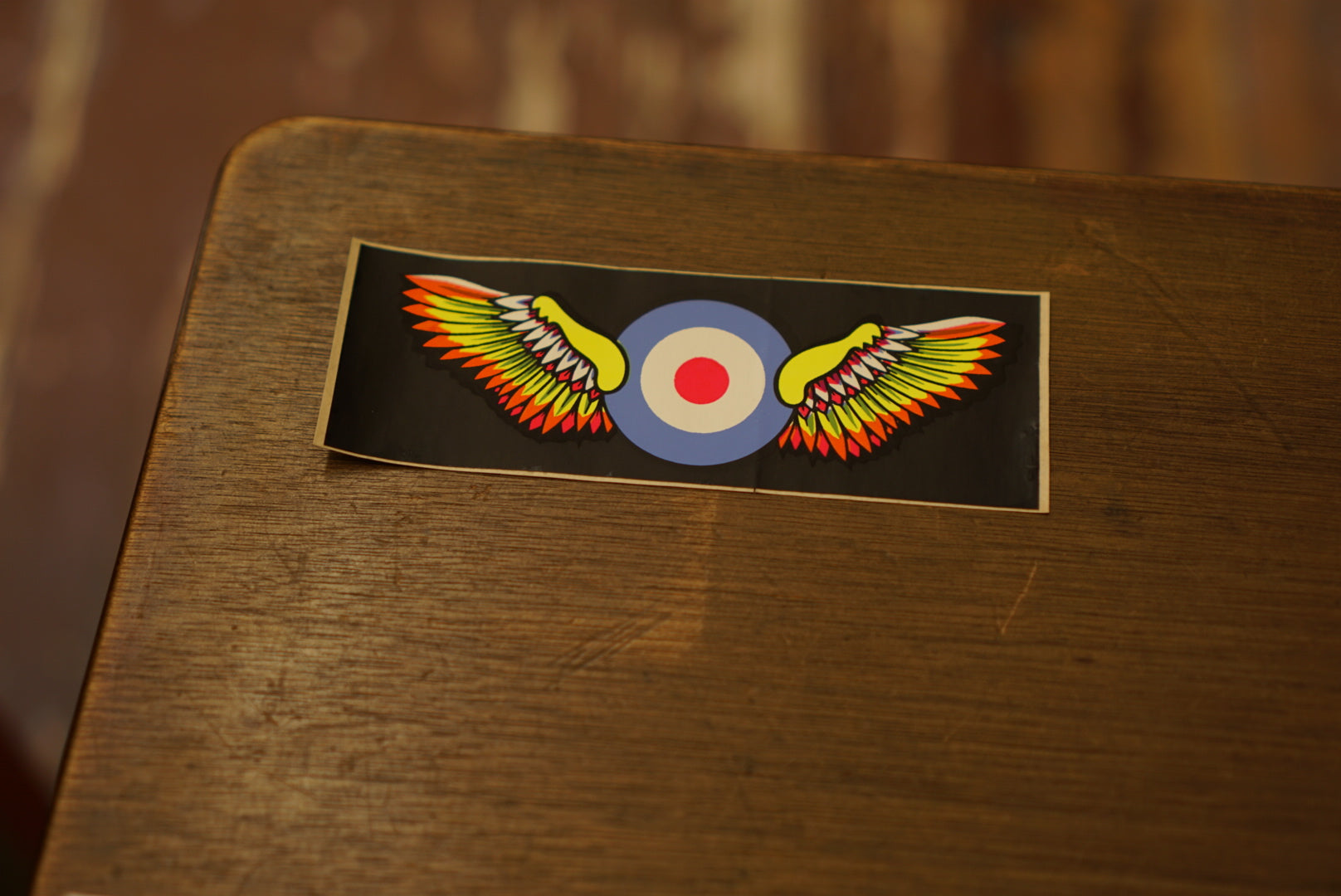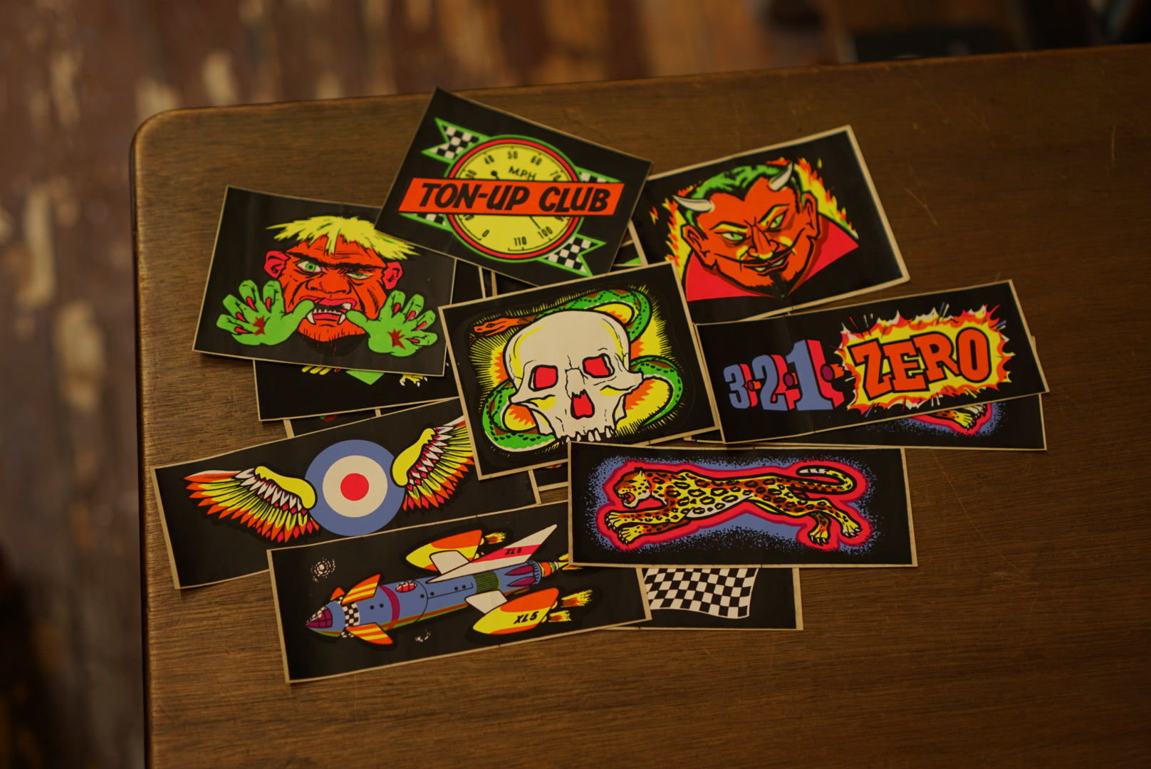 These screen printed 'stikkas' are new old stock, produced in the 1960's for jackets, mud-flaps and fairings. They were being sold by the Gledhow Transfer Company in Leeds before it closed and the stock was put away to be discovered 60+ years later.