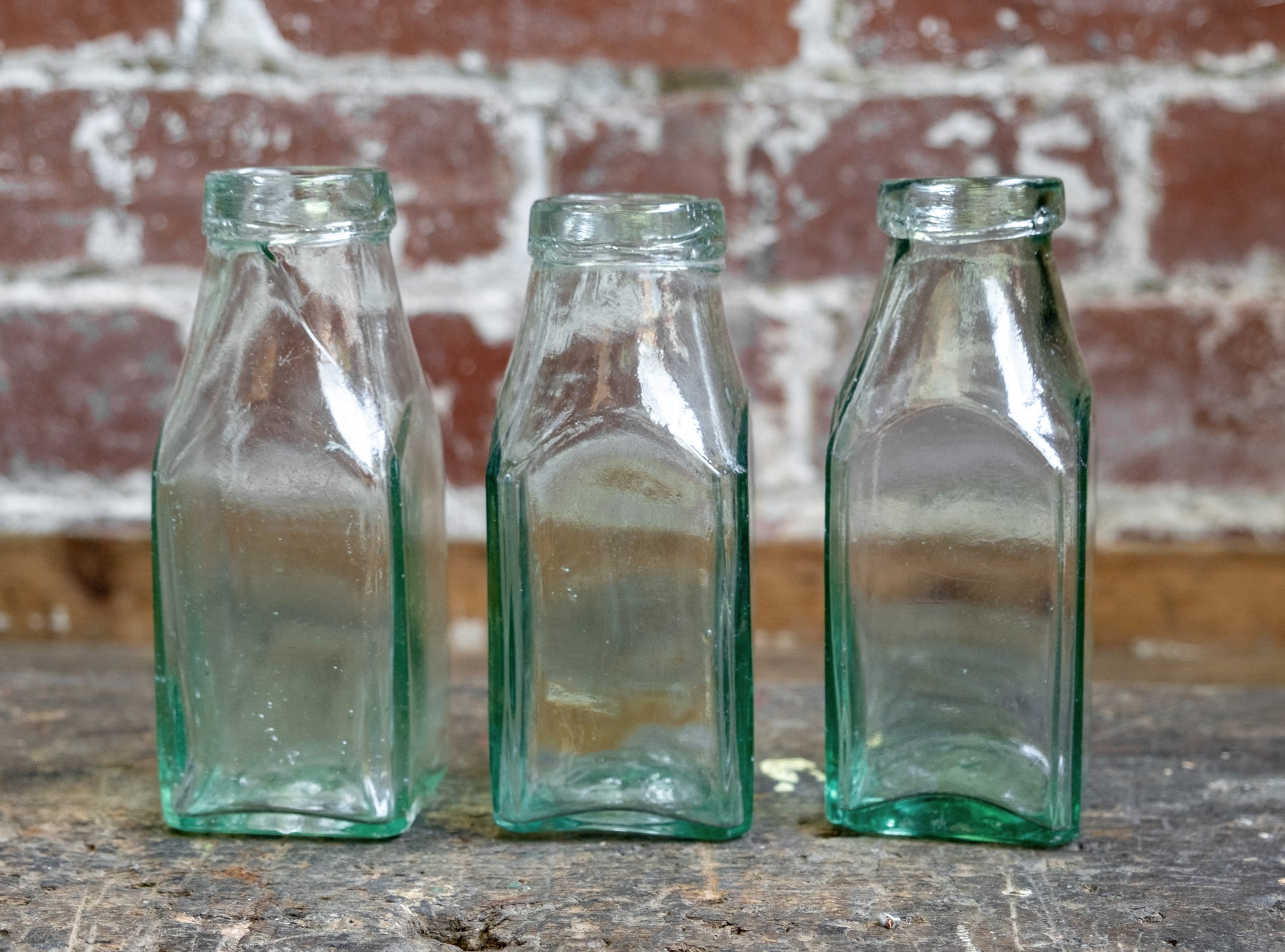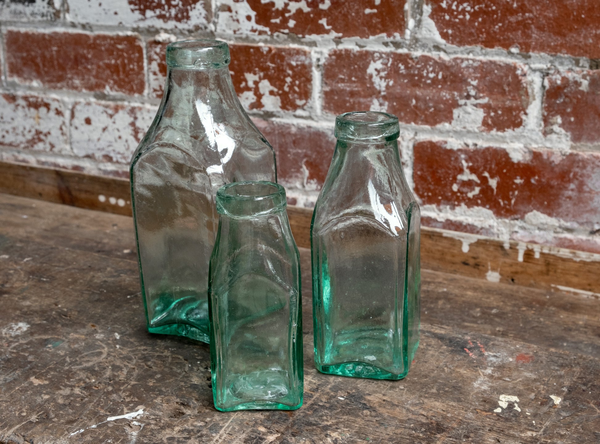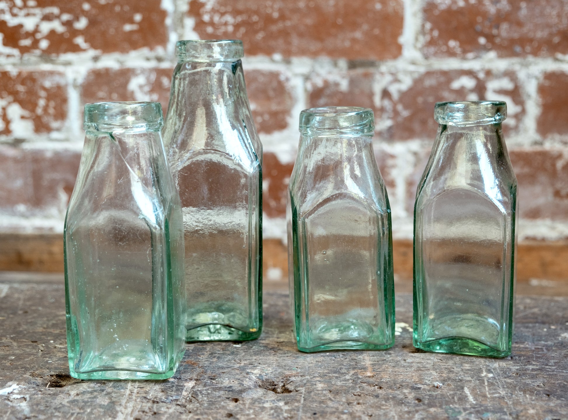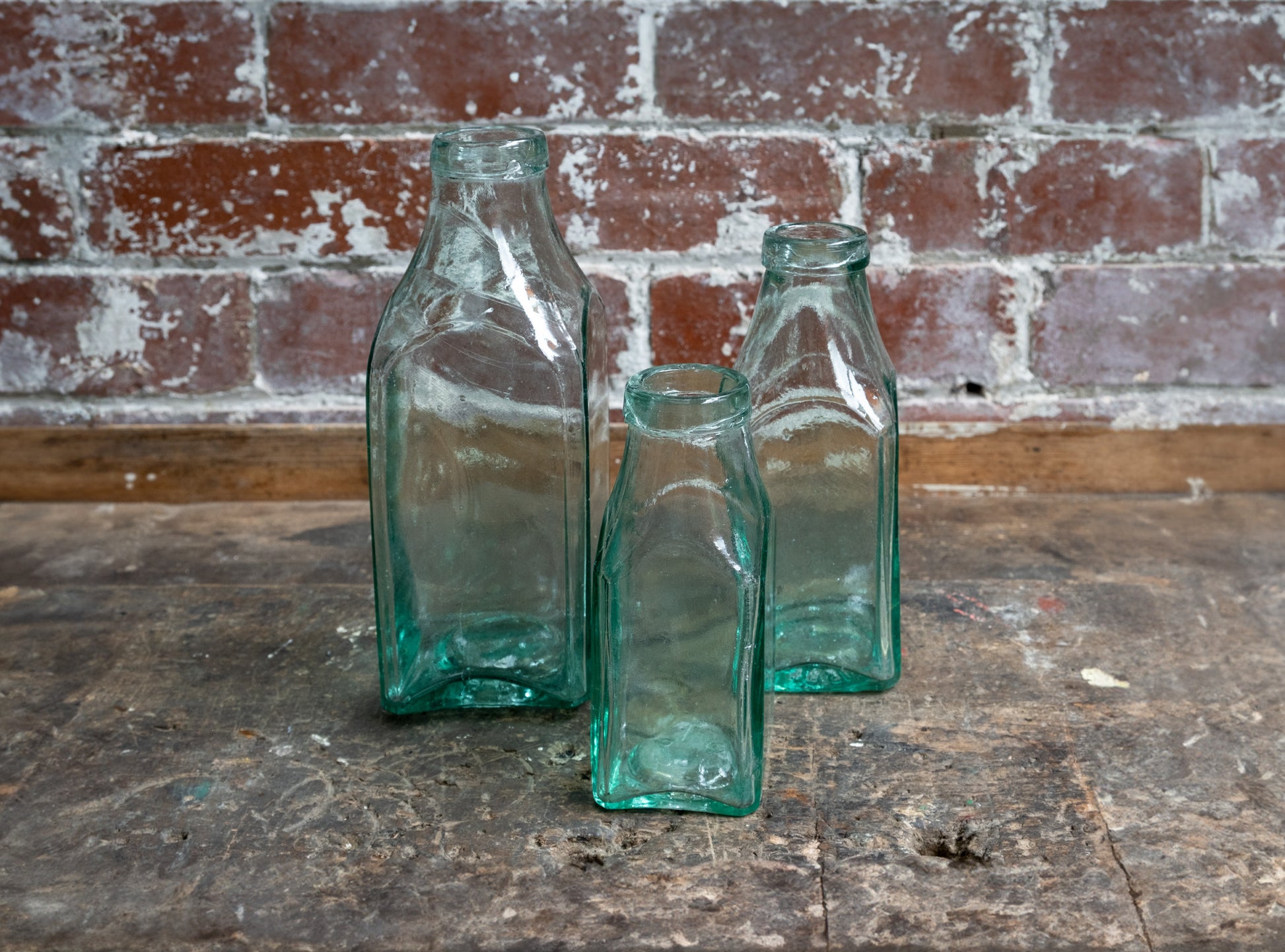 Antique glass milk bottles handblown in a range of clear aqua-toned glass. These bottles have a squarer shape than the traditional round milk bottles, and the neck is narrower than the body.