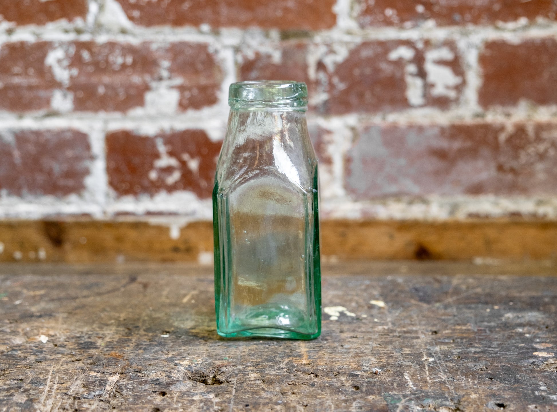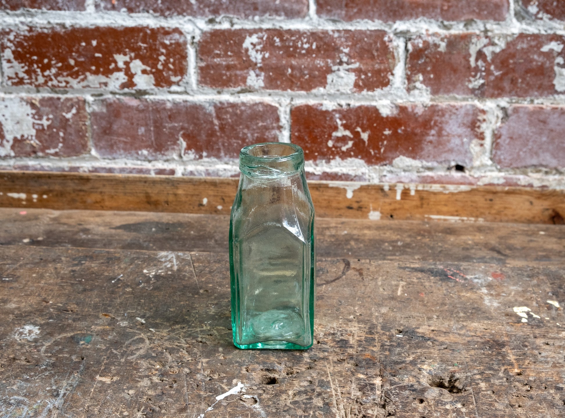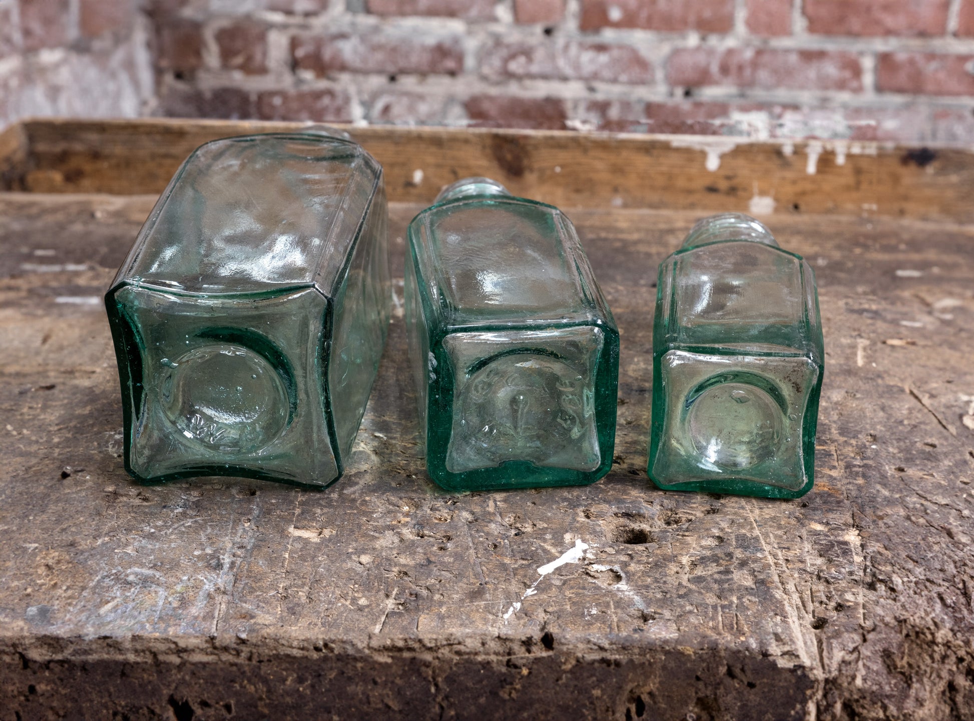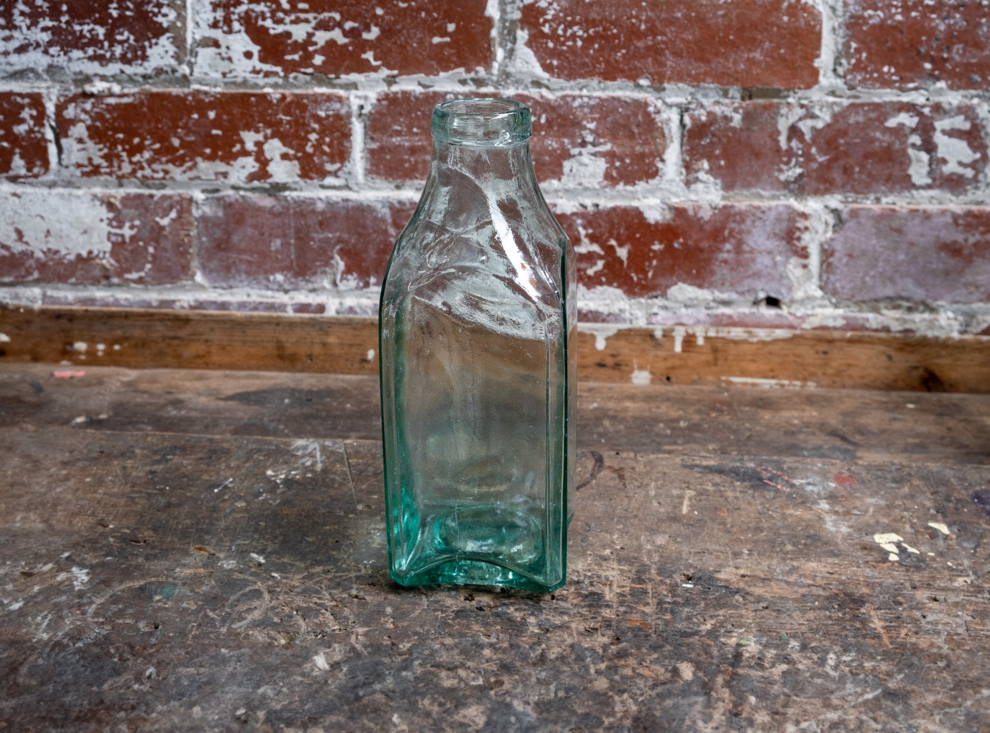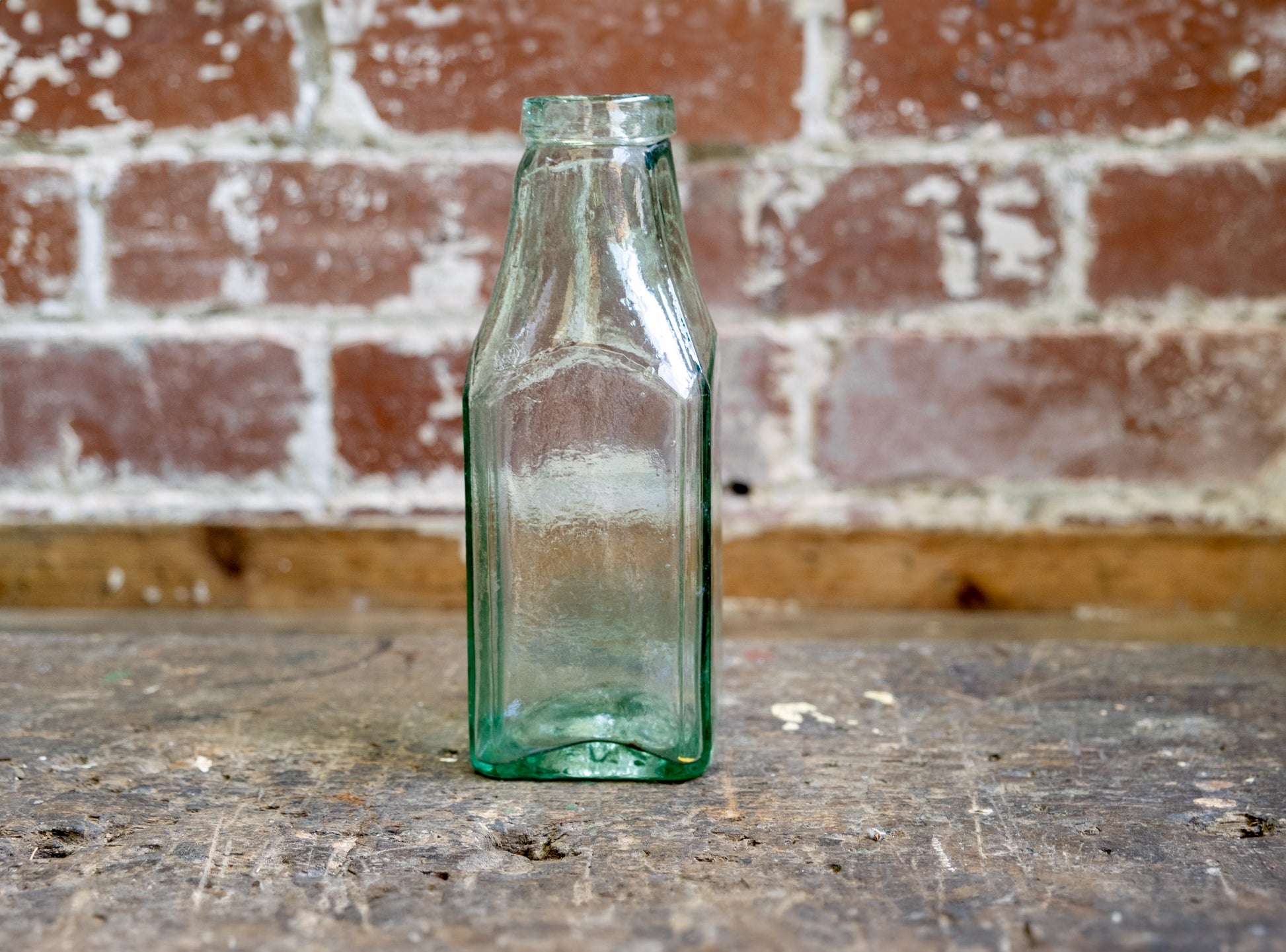 Antique glass milk bottles handblown in a range of clear aqua-toned glass. These bottles have a squarer shape than the traditional round milk bottles, and the neck is narrower than the body.