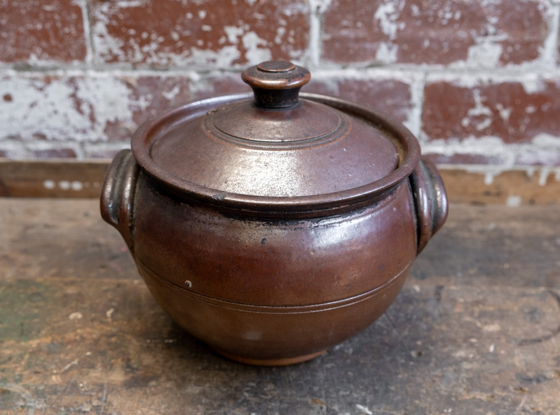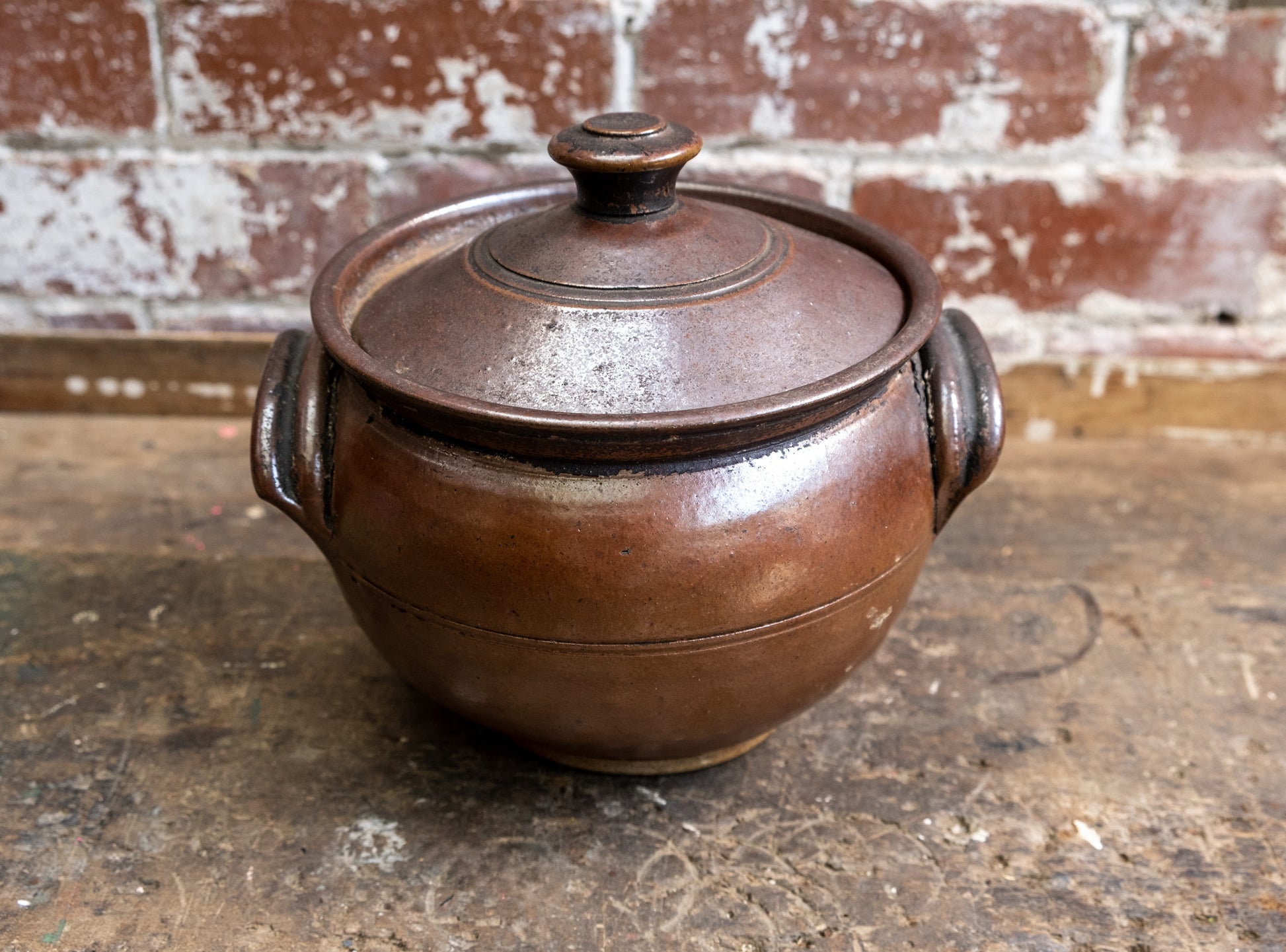 A really nice example of an antique lidded stoneware cooking pot. The interior has glazing with craze marks that add to the appeal. The exterior has a nice almost metallic brown finish.