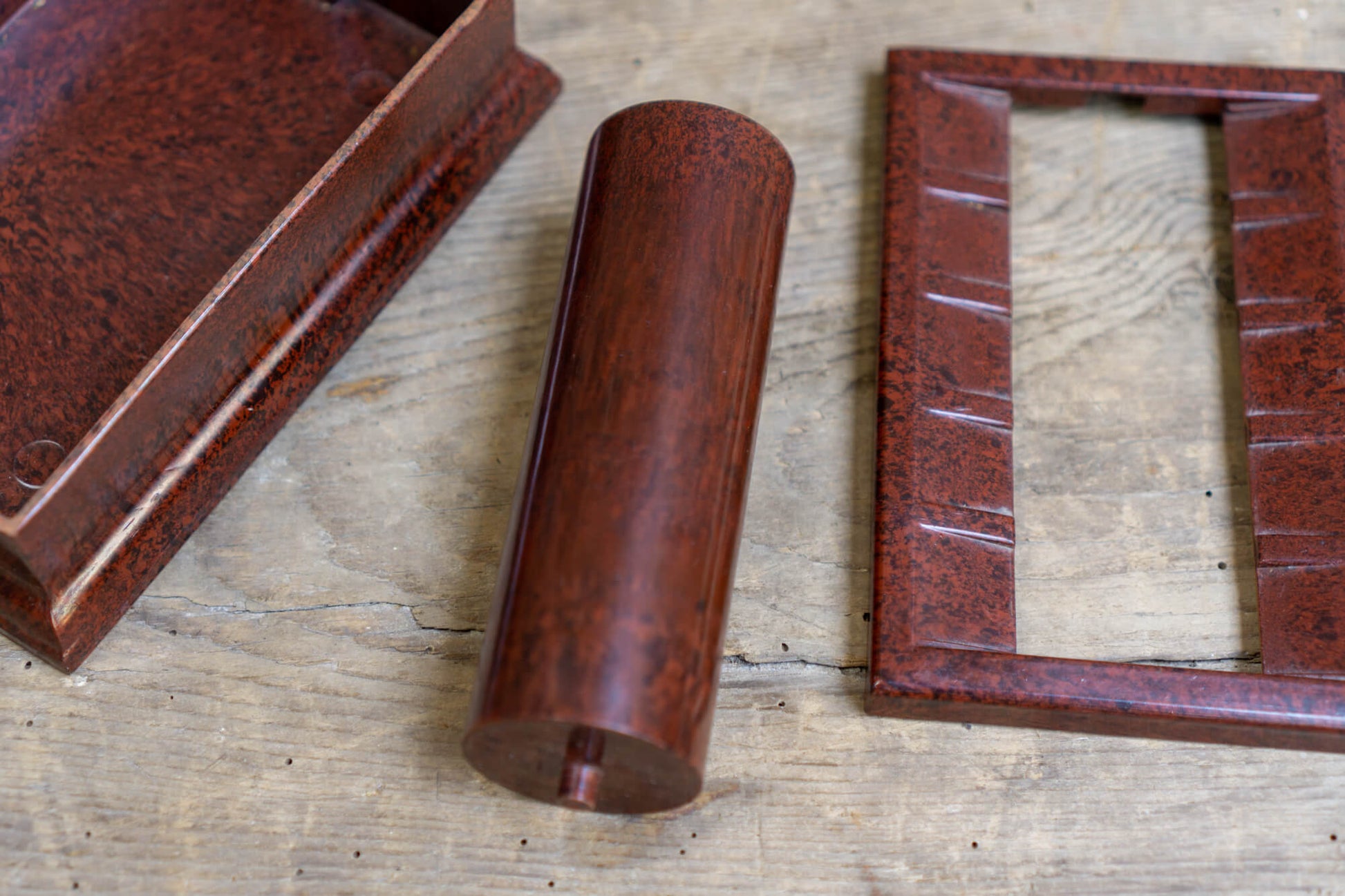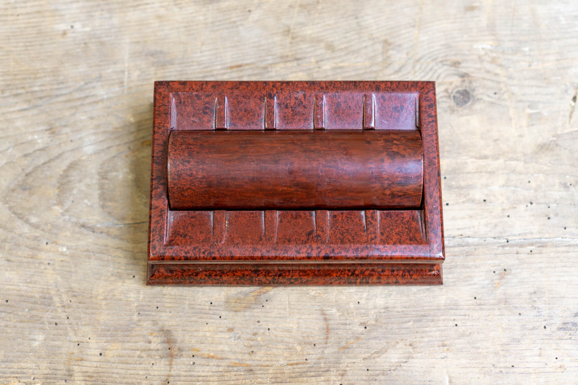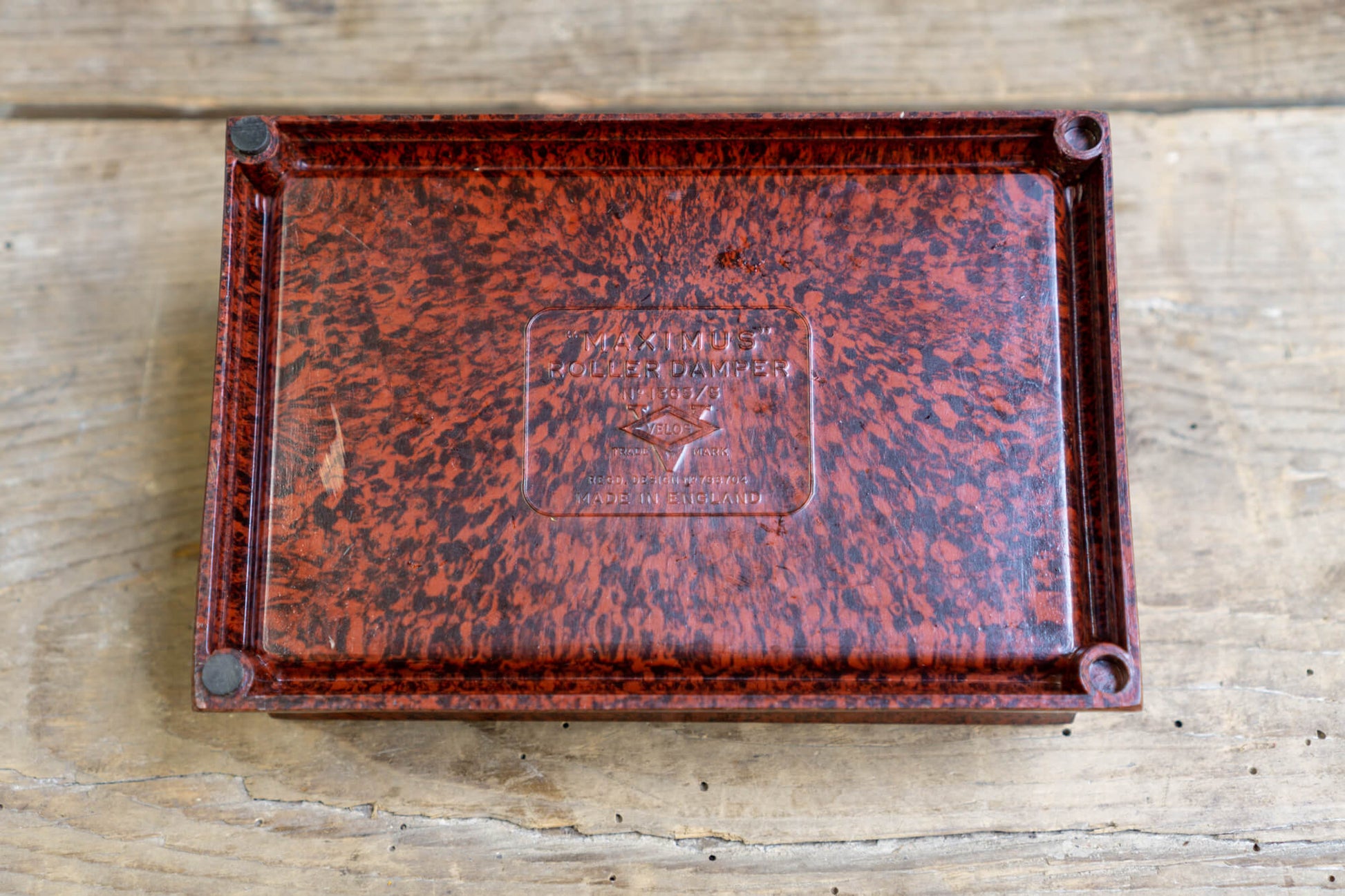 It has three sections; the base, the roller and the lid, all made from a red-brown, marbled Bakelite. Moulded into the base are the makers details: 'Maximus' Roller Damper, Velos, Made in England'.