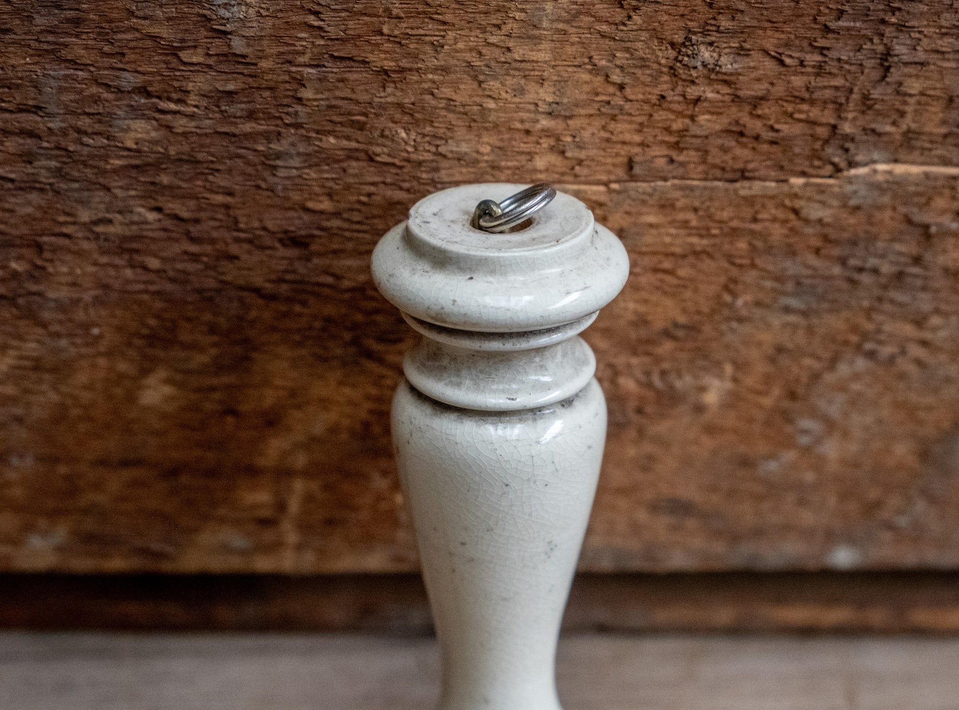 This is an original porcelain pull handle, originally for a chain or pull-string fixture to flush the commode.