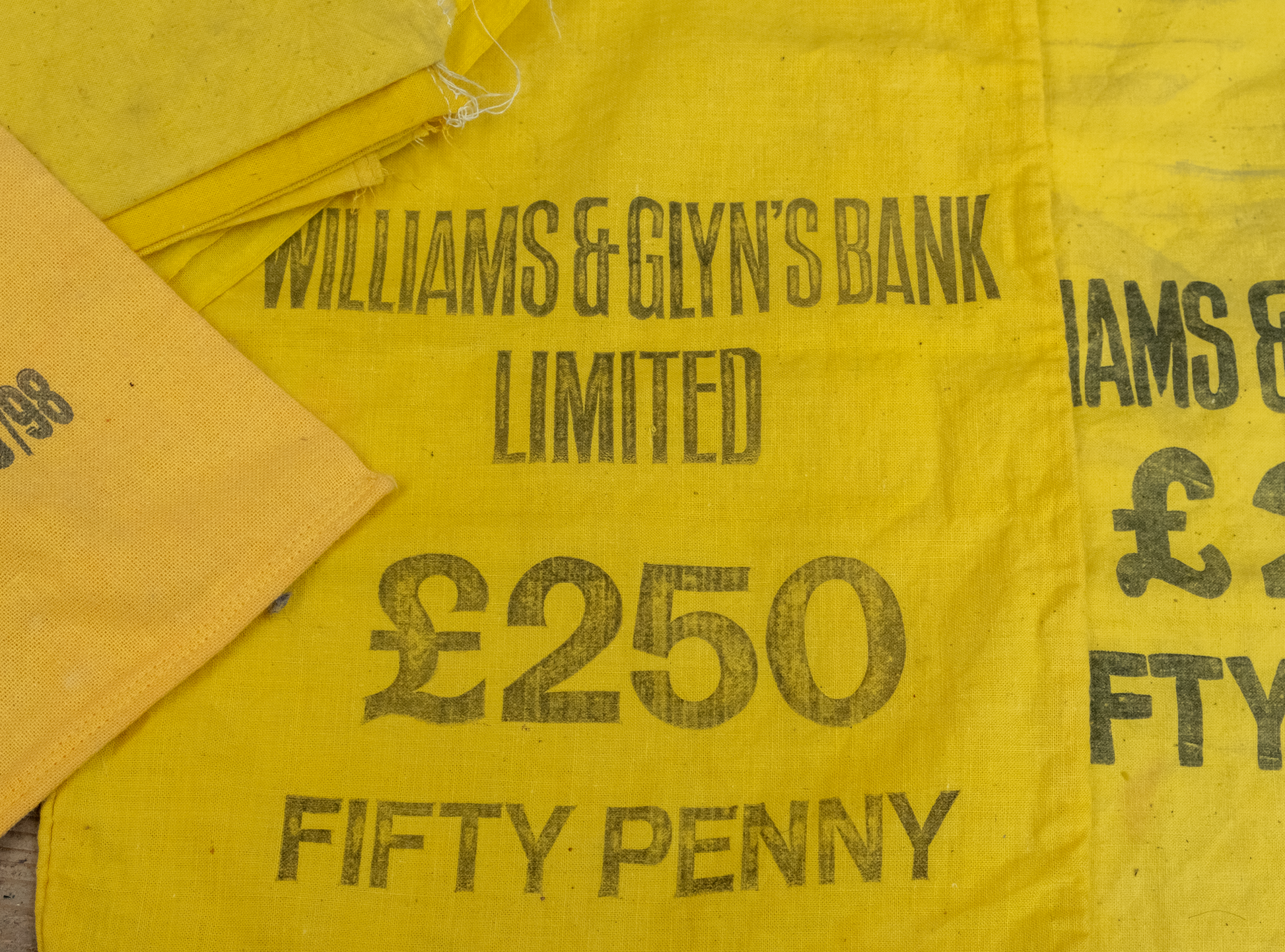 These vintage cloth change bags from Williams & Glen’s and Barclays banks originally held £250 and would have been used by merchants for banking their takings. They come in variations of bright yellow with overlocked edges.