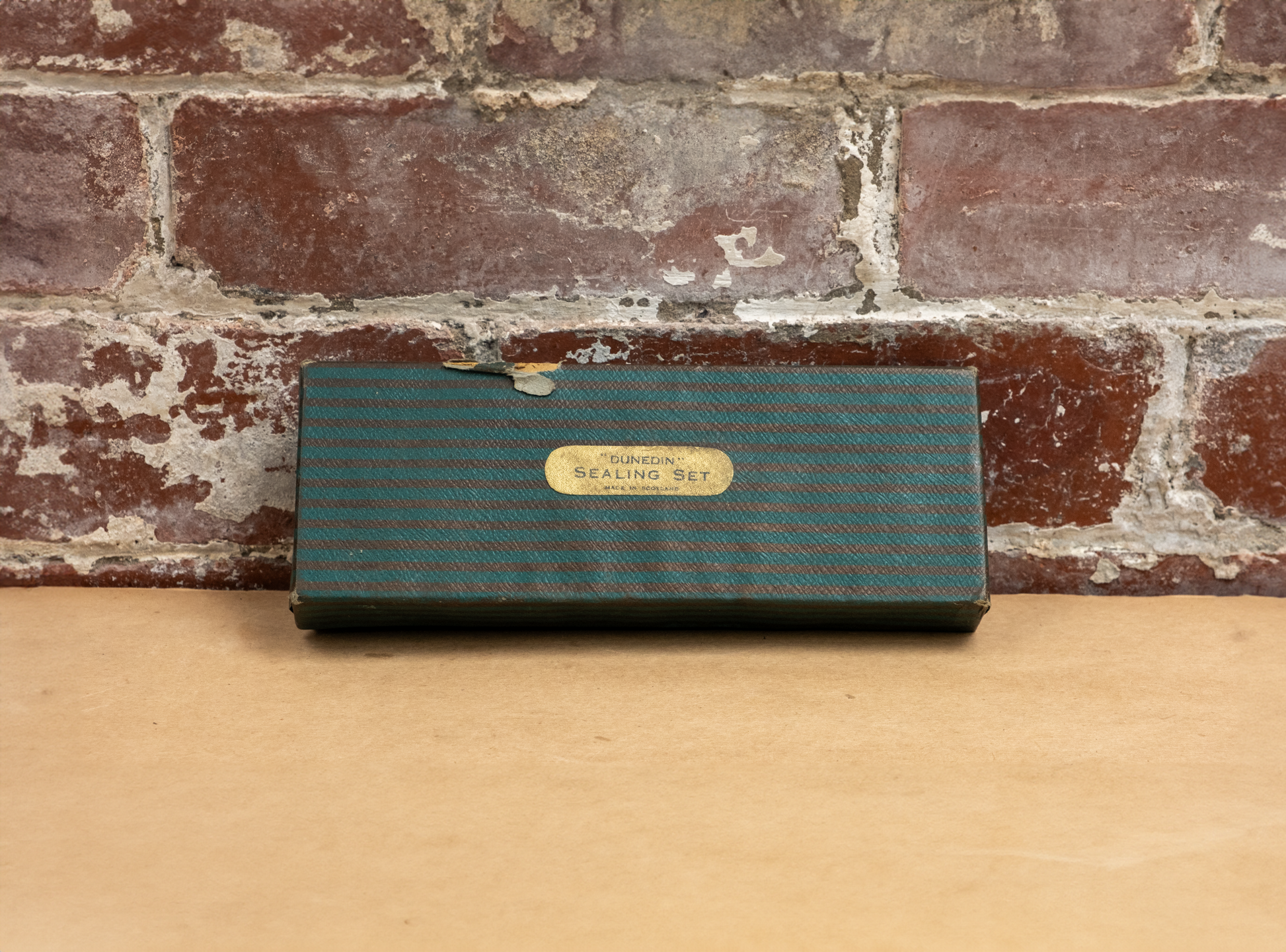 This vintage boxed sealing set comes complete with hard sealing wax, wax tapers, a melting pot and seal.
