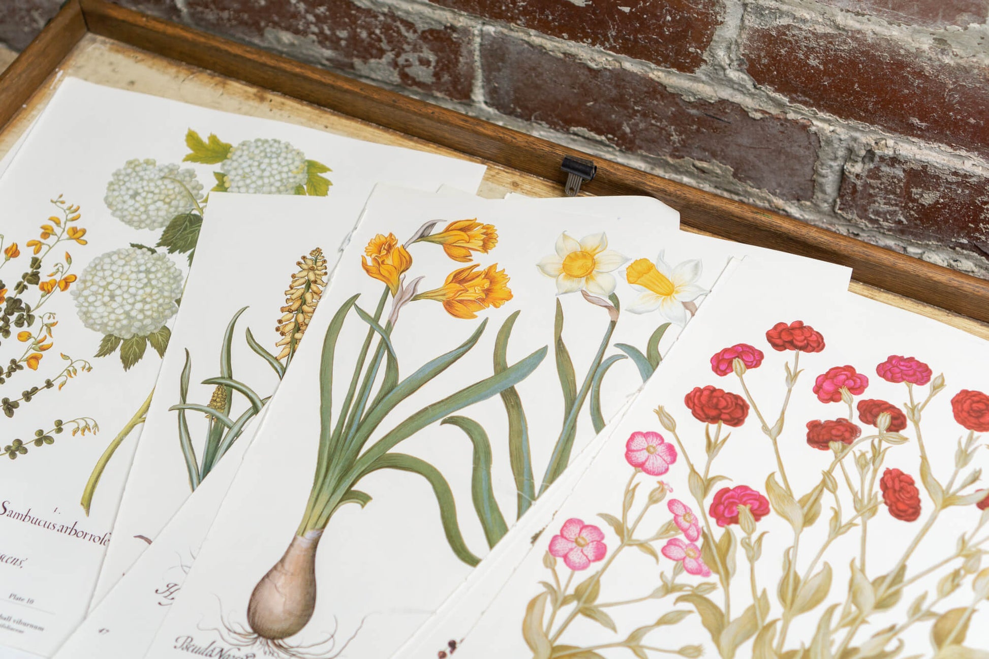 A large collection of vintage illustrated botanical flower prints. These are full-colour plates taken carefully from a vintage book. They are just short of modern A3 size and are portrait orientation.