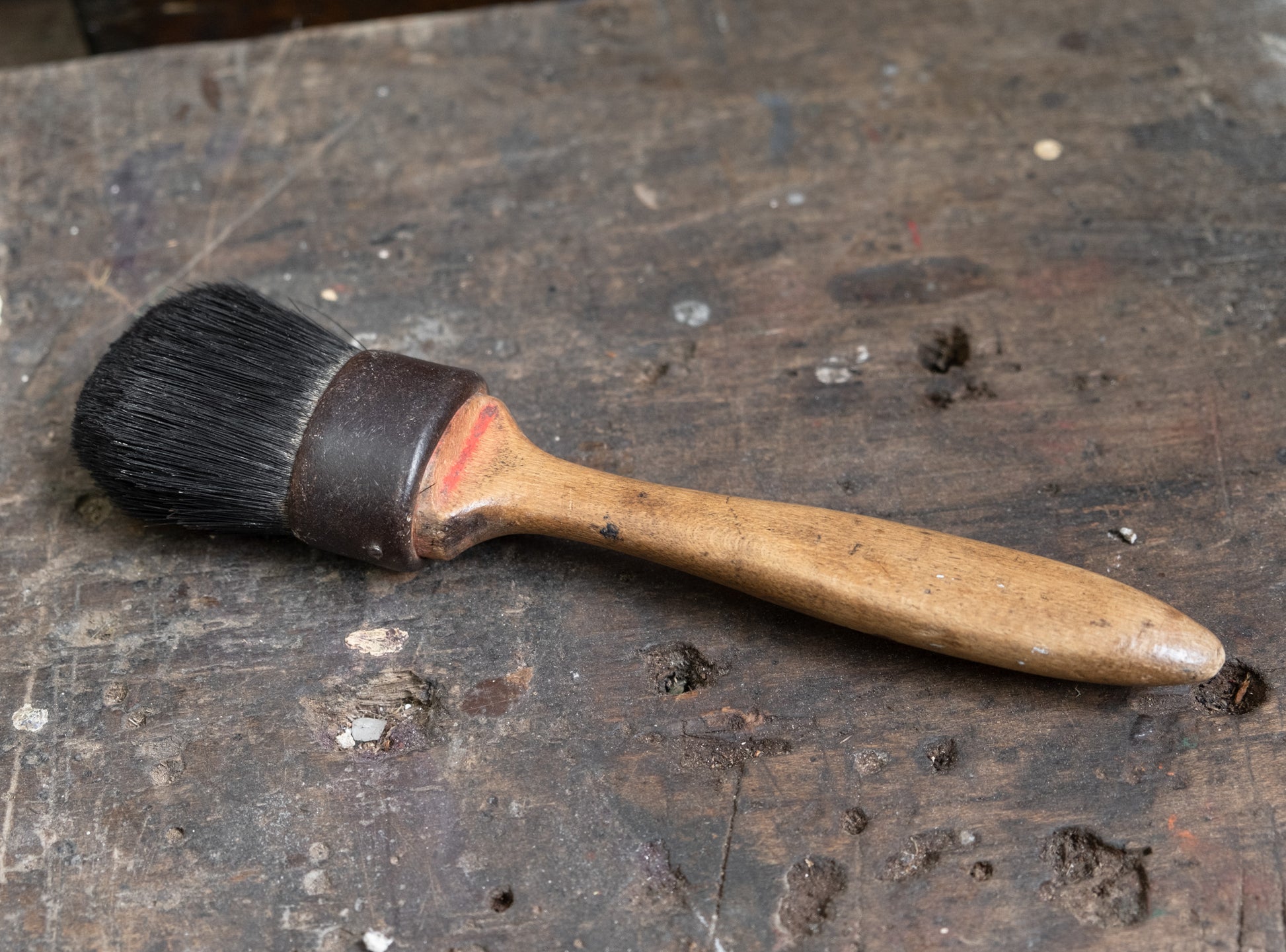 A wood handled British-made decorator's paint brush. For smaller decorating jobs such as cutting in and painting furniture.