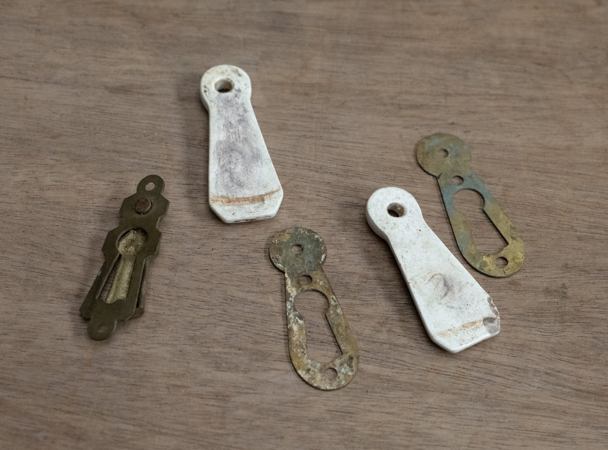 These escutcheons are made to cover a keyhole. Available in brass with a white porcelain cover or brass with a brass cover.