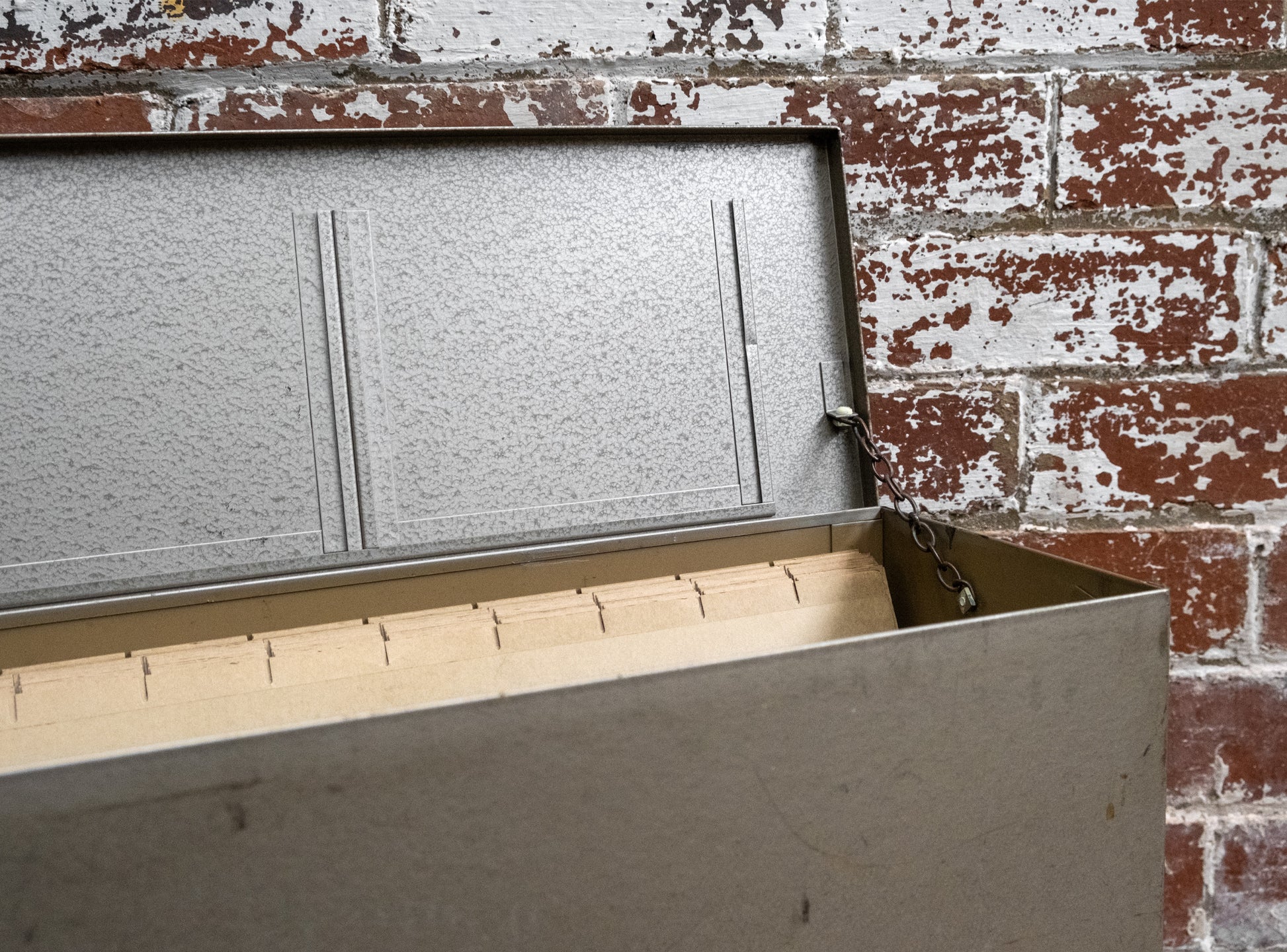 Fully metal with paper filing dividers, the case has handles, a chain inside to hold the lid securely open, and a nice logo to the front.