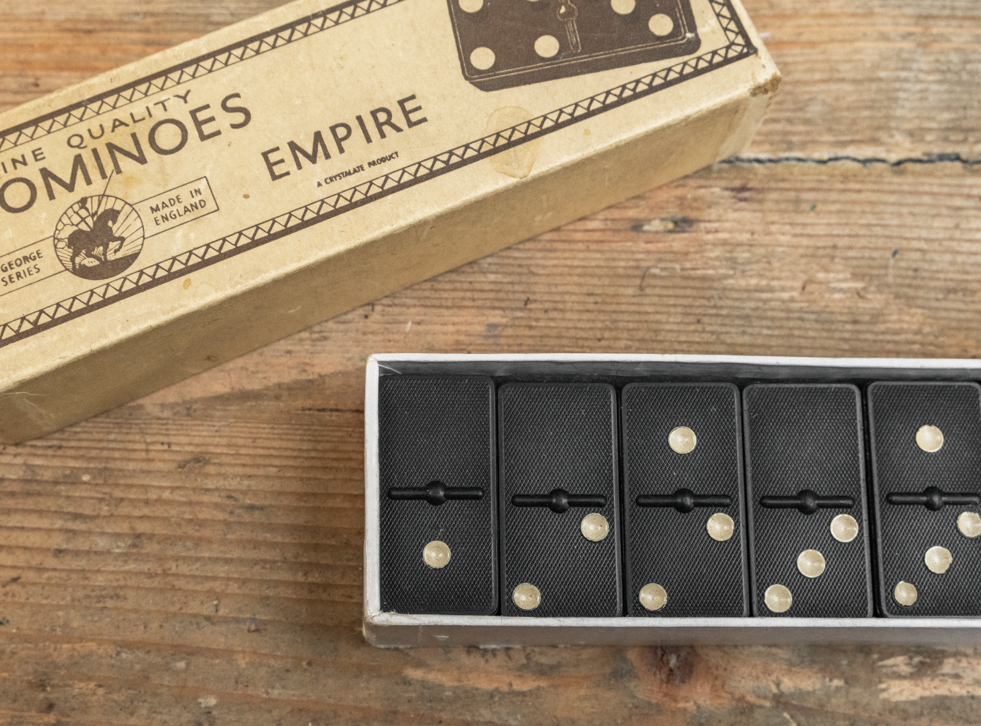 Vintage boxes of dominoes manufactured by St. George in England. The original packaging describes the product as a 'crystalate' and they come in a traditional brown and white design.