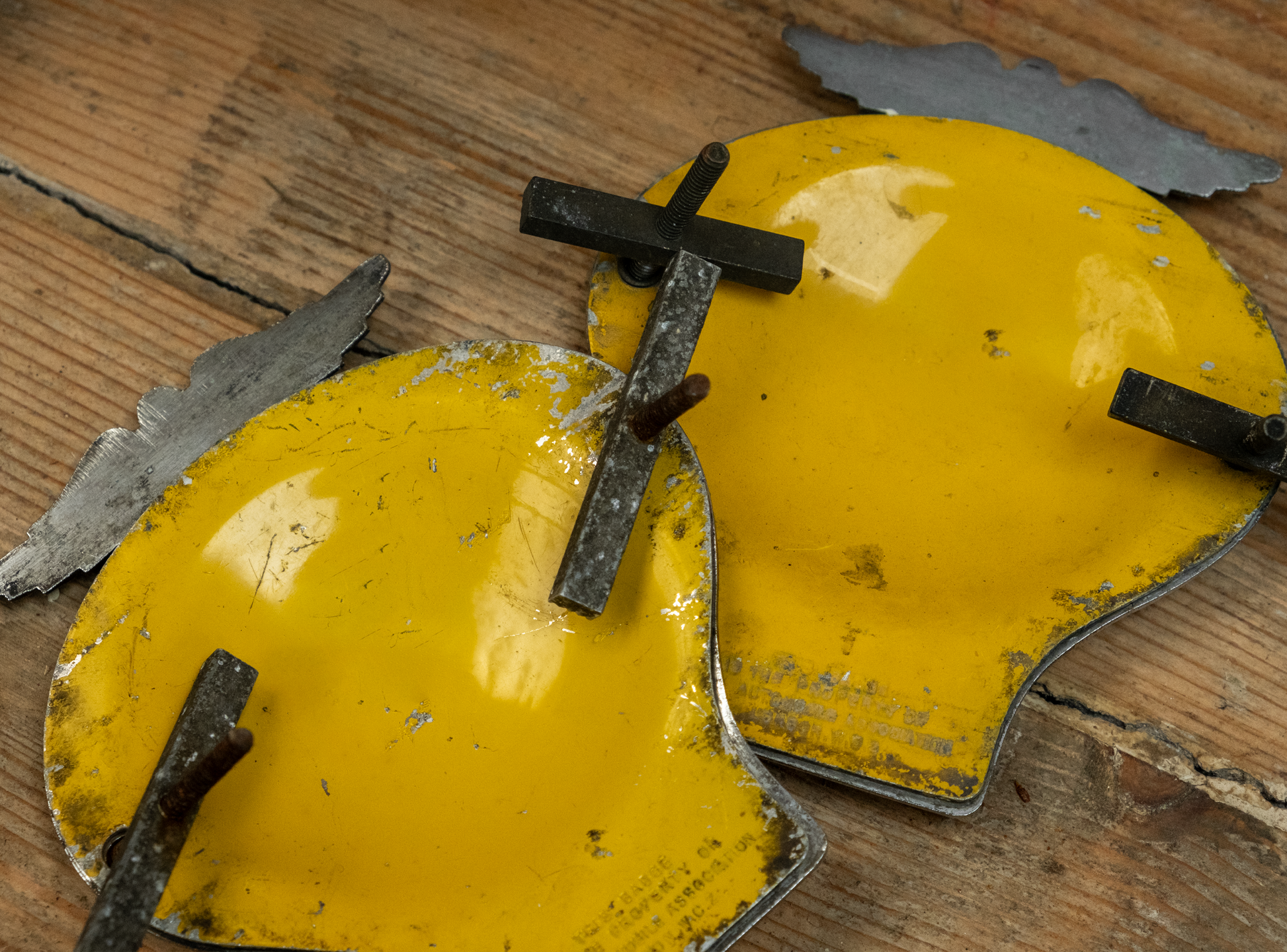 These vintage badges come from the Automobile Association in London c. 1961-1963. Made of chrome and enamel they have a contrasting silver metallic emblem over a yellow insert. They come complete with the original fittings.