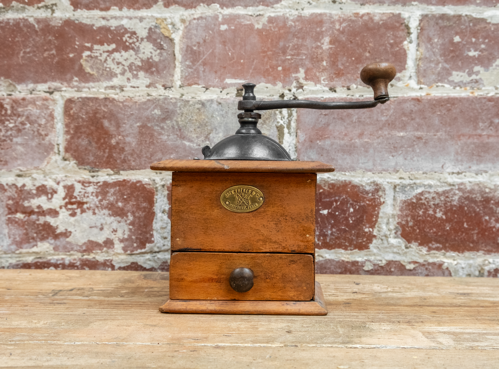 A great wooden coffee grinder produced by Jay Frees and Co in Beaucourt Paris. There is a brass pressed decal to the face. The overall body, metal handle and grinder are in good condition.
